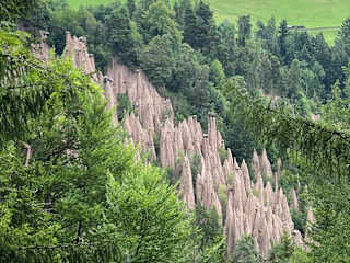 Die Erdpyramiden am Ritten sind die höchsten und formschönsten in Europa. Das in trockenem Zustand steinharte Material wird zu einem lehmigen Brei, wenn es mit Wasser in Verbindung kommt und fließt so dementsprechend zu Tal. Wenn aber ein Stein im Material eingelagert ist, so hält dieser das darunter liegende Material trocken und hart und so wachsen die Erdsäulen bis zu einer Höhe von 30 m aus dem Boden. Das Material der Rittner Erdpyramiden ist ein späteiszeitlicher Moränenlehm, der sowohl von dem großen Eisacktaler Hauptgletscher als auch von lokalen Nebengletschern hier aufgeschüttet und zurückgelassen wurde. In trockenem Zustand ist dieser Rittner Moränenlehm steinhart, feucht wird er zu einem lehmigen Brei, welcher Hang abwärts zu rutschen und fließen beginnt. Dieser ständige, immerfort zehrende Abrutsch des Möränenlehms findet erst dann ein vorläufiges Ende, wenn dieser so genannte Boden aschtrocken und darum steinhart ist und ein schnelles Abrutschen verhindert. So entstehen jene Steilwände mit einer Höhe von 10 bis sogar 15 Metern, welche die Voraussetzung für die Bildung der Erdpyramiden sind. Aus diesen Steilhängen werden nun die Erdpyramiden förmlich "herausgewaschen", genauer gesagt, aus ihr heraus gewittert, vorausgeschickt, dass sich im Moränenlehm größere Steine befinden, die das unter ihnen liegende Moränenmaterial möglichst lange trocken und damit hart erhalten. Je höher die Steilwand und je höher oben in ihr der geeignete Stein liegt, um so höher und mächtiger wird dann die Pyramide werden. Wie lange es braucht, bis sich eine Erdpyramide herausgebildet hat, ist schwer zu sagen, da hier zu viele Komponenten zusammen spielen. Ebenso wenig läßt sich sagen, wie alt eine Erdpyramide ist oder weden kann. Sicher ist nur, fällt der Deckstein aber erst einmal von der Spitze der Pyramide, so ist sie einem schnellen Untergang geweiht, denn dann ist das Material schutzlos dem Regen ausgesetzt und die Säule wird bei jedem Regen kleiner. Doch während durch diesen Vorgang eine Erdpyramide verschwindet, entsteht weiter oben am Hang schon die nächste. Erdpyramiden gibt es am Ritten im Finsterbachgraben nach Lengmoos, im Katzenbachgraben unterhalb von Oberbozen und im Gasterergraben in Unterinn. Als Ausflugstipp empfehlen wir eine Fahrt mit der Rittnerbahn von Oberbozen nach Klobenstein, wo dann der Wanderweg 24, ein einfacher flacher Weg in das Erdpyramidental startet, Gehzeit ca. 30 Minuten für den Hinweg. Hier finden Sie den Lageplan mit dem Wegverlauf zu den Rittner Erdpyramiden