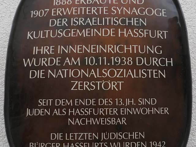 In Haßfurt steht in der Schlesingerstraße 9 ein recht unauffälliges Gebäude, das seit 2010 als Dienstgebäude des Staatlichen Schulamtes dient. Wäre nicht ein Schild angebracht, welches daran erinnert, dass sich in diesem Gebäude ab 1888 die Synagoge von Haßfurt befand, würde man nicht darauf kommen, dass dies doch ein besonderes Bauwerk ist. Am 10.Nov. 1938 wurde die Synagoge beim Novemberpogrom 1938 unter Führung von SA-Leuten aus Haßfurt und aus der Umgebung geschändet, die Fenster, Inneneinrichtungen, Geräte usw. wurden zerstört, die Torarollen, Bücher usw. wurden verbrannt, und dies alles unter den Augen der „braven Haßfurter Bürger“, die schaulustig und wohl auch begeistert zur Synagoge strömten. Da sich die Synagoge mitten in der Stadt befand, wurde sie nicht angezündet, da man wohl Angst hatte, dass das Feuer auf andere Gebäude übergreifen würde.