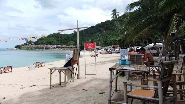 Neben dem Imperial Samui hat im Juni 09 eine neue Cocktailbar aufgemacht mit super leckeren und preislich am günstigsten Cocktails! Man kann an gemütlichen 2-er oder 3-er Sofatischen sitzen und aufs Meer schauen oder es sich auf einer Liegematte im Sand bequem machen. Moderne Musik, zum Teil europäische Hits. Nette junge Betreiber! Gut zu erkennen durch die farbigen "Würfel"-Lichter am Rand! Zu unserer Zeit sind auch nur sehr wenige Strandverkäufer dort hingegangen!