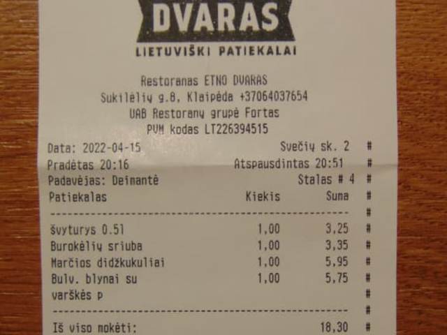 Die kleine Restaurantkette "Etno Dvaras" unterhält einige Lokale mit deftiger, authentischer litauischer Küche u. a. in Vilnius, Kaunas und eben auch in Klaipeda und anderen Orten. Die Bewertung erfolgt hier für das urige und gemütliche Lokal in Klaipeda in der Sukeliu gatve 8, am Theaterplatz. Das Lokal ist litauisch urig und gemütlich, allerdings auch etwas verstaubt und "altbacken" eingerichtet. Es gibt eine offene Tischanordnung und für den Sommer bzw. die Saison wohl auch eine Art Zelt bzw. Wintergarten draußen - beides aber mit Blick auf den Theaterplatz direkt gegenüber. Die Karte ist wie in allen Filialen der Kette groß und identisch - es wird ausschließlich deftige, litausche Küche angeboten. Kartoffelpuffer, Kartoffelklöße, Fleisch, Suppen, Salate und gutes litauisches Bier. Die Speisekarte ist bebildert und auch auf Englisch. Die Bedienung spricht ebenfalls Englisch und ist überaus höflich, freundlich und sehr enthusiastisch! Die Gerichte, die ich jeweils bestellt habe zu verschiedenen Besuchen, haben alle überaus gut geschmeckt. Das Preisniveau ist dabei auch niedrig. Ich hatte sogar das Gefühl, daß die Preise hier niedriger waren als in der Filiale in Vilnius. Auch für die Filiale in Klaipeda spreche ich eine absolute Empfehlung aus! Hier die Kontaktdaten: Etno Dvaras Sukileli gatve 8 Klaipeda Tel +370 640 376 54; bei Anrufen innerhalb Litauens 8-640 376 54 www.etnodvaras.lt