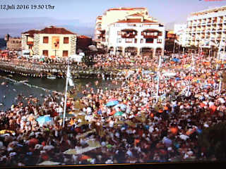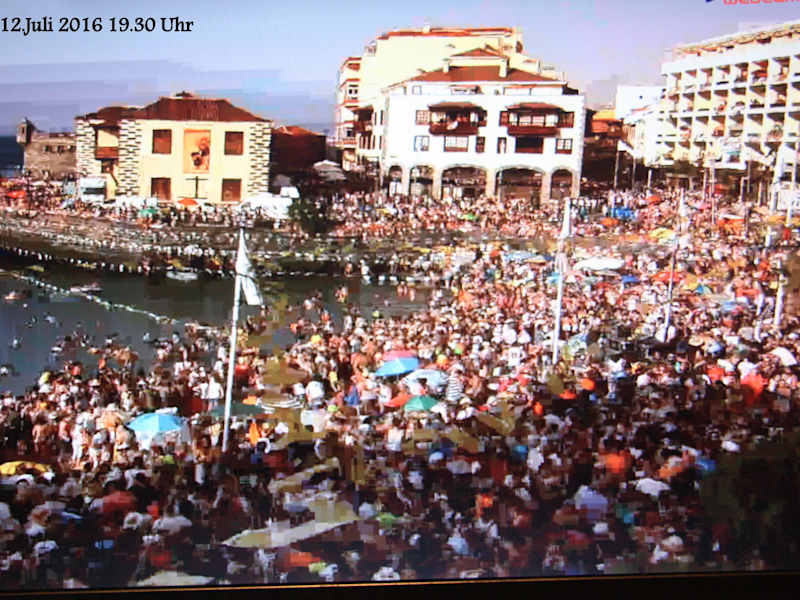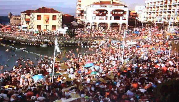 Am 12. Juli feiert Puerto de la Cruz das Fest der Schutzheiligen der Fischer. Den ganzen Tag wird in der Altstadt rund um den kleinen Hafen Puerto Pesquero gefeiert. Am Hafen ist eine große Bühne aufgebaut, hier treten ab ca. 11:00 Uhr Folkloregruppen auf. In den Nebenstraßen erfolgt die Beschallung aus den Kneipen und Bars. Viele Familien und Gruppen haben sich bereits am Abend vorher die besten Plätze am kleinen Strand oder auf der Kaimauer reseviert, mit Sonnenschirmen oder Zelten. Am späten Nachmittag oder am Abend, in diesem Jahr gegen 19:00 Uhr begann der Höhepunkt des Festes. In feierlicher Prozession wird die Statue der Virgen del Carmen aus der Kirche Nuestra Senora de la Pena de Francia durch die Straßen zum Hafen getragen. Hier wird die Statue auf ein Schiff gehoben und man fährt mit Ihr in einer Schiffsprozession die Küste entlag und erbittet den Segen für die Fischer, dass sie vor Unheil geschützt werden und mit gutem Fang zurückkehren. Danach wird die Statue der Virgen del Carmen wieder im Prozessionszug zur Kirche zurückgebracht. Die Prozession wurde in diesem Jahr von etwa 50000 Menschen begleiet. Den ganzen Tag über nahmen mehr als 120000 Menschen an den Feierelichkeiten teil. Zum Vergleich, Puerto de la Cruz hat ca. 40000 Einwohner. Den Abschluß des Festes bildet, wie sollte es auch anders sein, ein großes Feuerwerk.