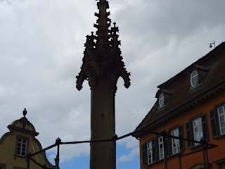 Es ist ein sehr schöner Brunnen auf dem Marktplatz. Hier wurden früher Fische verkauft, daher der Namen. es ist ein Kastenbrunnen. ( Man lernt nie aus. )
