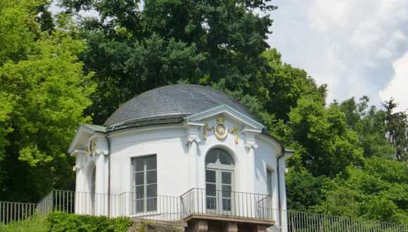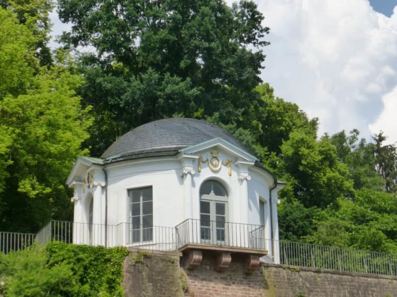 Bei unserem Spaziergang durch den Schlossgarten sind wir an dem kleinen, runden, weißen Frühstückstempel vorbeigekommen. Von hier hat man einen schönen Ausblick. Gleich neben dem Gebäude fällt der Hang runter zum Main ab. Vom Frühstückstempel ist man nach wenigen Minuten beim Schloss Johannisburg, oder, wenn man in die andere Richtung geht, beim Pompejanum.