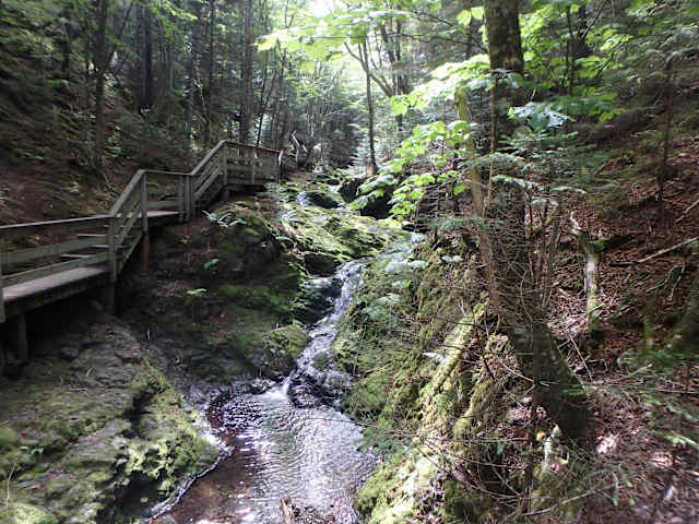 Der seit 1948 bestehende Fundy Nationalpark wird durch etwa 120 Kilometer gut ausgebauter Wanderwege verschiedener Schwierigkeitsgrade erschlossen, die alle gut ausgeschildert sein sollen. Einen Plan kann man u.a. beim Informationszentrum am östlichen Parkeingang bei Alma erhalten. Die Wanderungen sollen alle durch eine sehr abwechslungsreiche Landschaft führen. Da wir den Park im Rahmen einer Ostkanada-Rundreise besuchten, hatten wir nur Zeit für den Rundweg zu den Dickson-Wasserfällen. Die von vielen Treppenstufen geprägte Piste verlief entweder auf natürlicher Erde oder über Bohlen auf und ab durch das Gelände. Diese ist u.E. nicht geeignet für Wanderer mit Gelenkproblemen. Außer einem Eichhörnchen haben wir leider keinerlei Tiere gesehen.