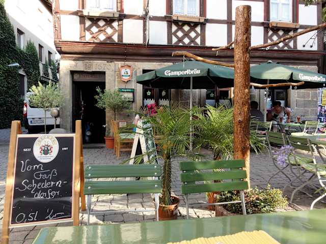 In der „Genuss- und Bierregion“ Oberfranken staunt der Besucher – selbst in kleinen Ortschaften gibt es wenigstens eine Brauerei – oftmals sind es sogar deutlich mehr... In Lichtenfels gibt es keine Wirtschaft, die das heimische Bierangebot besser spiegelt als das „Pinkus“ am Säumarkt, einen Steinwurf vom „Unteren Tor“ entfernt: Jede Woche ist ein anderes regionales Bier vom Fass im Angebot – für den halben Liter sind dann gerade 2 Euro zu zahlen – günstiger geht es kaum! Auch sonst bleibt kein Wunsch offen: Allein zwei verschiedene Rauchbiere aus Bamberg sind auf der Karte verzeichnet – sie verlieren sich allerdings in den über 30 verschiedenen Spezialitäten dieser Region – das „Pinkus“ ist ein Paradies für Bierliebhaber! Vor der Kneipe stehen zahlreiche Tische in der Abendsonne – das Interieur ist stilistisch in dunklem Holz gehalten und in seiner altertümlichen Art durchaus ansprechend. Die Speisekarte des „Pinkus“ befriedigt den Hunger mit fränkischen Klassikern, die „Schnitzelkarte“ am Mittwoch ist einmalig: Für gerade 7,90 Euro gibt es einen Teller, der selbst hartgesottene „Großportionsesser“ an Leistungsgrenzen führt – unglaublich! Der Besuch ist lohnend und besonders schön an einem Sommerabend, wenn man vor dem Pinkus an Tischen und Biergartenbänken unter freiem Himmel sitzen kann.