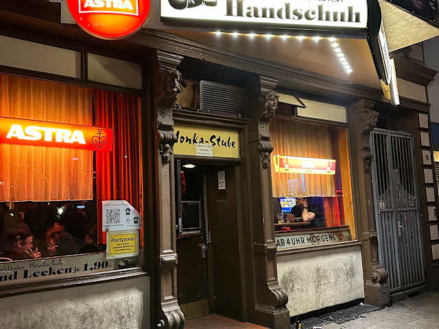 Der "Goldene Handschuh" ist ein Etablissement in einer Seitenstraße der Reeperbahn, dem "Hamburger Berg". Dort trifft sich allerlei illustres Volk, Obdachlose, Trinker, Prostituierte. Es ist 24 Stunden, 7 Tage die Woche geöffnet. Getränke gibt es nur aus Flaschen. Man sollte auf seine Geldbörse achten. Die Preise sind zivil. Die Einrichtung im 70er Jahre Stil alt und abgeranzt. Es werden deutsche Schlager zum mitgrölen gespielt. Wenn man hart im nehmen ist und sich an den o. g. Sachen nicht stört, sollte man dort auf jeden Fall mal auf ein paar Bier vorbeischauen. Dort erlebt man noch das "echte" St. Pauli, abseits der Glitzerdiscos und Musicals.