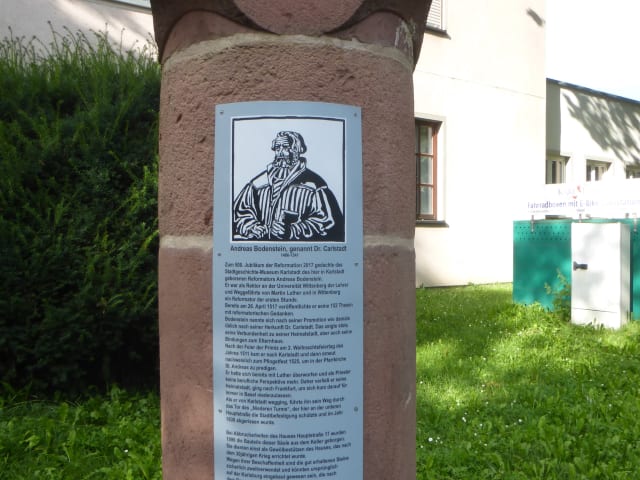 Im Norden der Altstadt von Karlstadt am Main befindet sich in den Jahnanlagen (bei der Jahnstraße / Ecke Hauptstraße) eine Säule zum Gedenken an Andreas Bodenstein (genannt Dr. Carlstadt), der 1486 in Karlstadt geboren wurde und 1541 in Basel starb. Andreas Bodenstein war Theologe, Priester, Hochschullehrer und auch Reformator. Bodenstein lehnte erst die Lehren von Martin Luther ab, später wandelte er sich jedoch zu einem Anhänger Luthers. Diese Säule (mit einer Informationstafel zum Leben und Wirken von Andreas Bodenstein) wurde 2017 zum 500-jährigen Jubiläum der Reformation aufgestellt. Wenn man bei der Jahnanlage im Norden der Altstadt ist, so bietet sich ein Abstecher zu dieser Säule an.