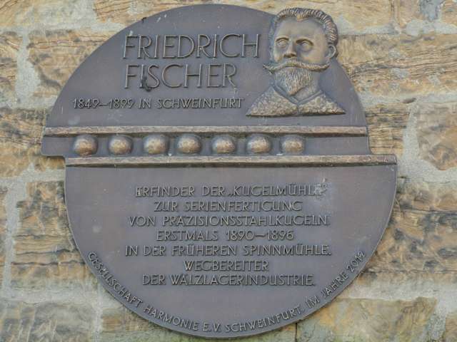 In Schweinfurt befindet sich an dem Gebäude Gutermann-Promenade 1 (Ecke Gutermann-Promenade / Brückenstraße / Maxbrücke) eine Gedenktafel in Bronze, mit der Friedrich Fischer (geboren 1849, gestorben 1899) geehrt wird, welcher der Erfinder der „Kugelmühle“ ist. Mit dieser Kugelmühle war es erstmals möglich, Stahlkugeln in größeren Mengen mit nahezu gleichem Durchmesser herzustellen. Mit dieser Art der Kugelproduktion konnten nun Stahlkugeln mit nur geringen Abweichungen gefertigt werden, womit Friedrich Fischer die Grundlage für die Schweinfurter Kugellager- / Wälzlagerindustrie legte. Alleine diese Tatsache rechtfertigt diese Gedenktafel für Friedrich Fischer und wenn man bei der Brückenstraße / Maxbrücke ist, so bietet es sich an, dass man sich diese auch einmal anschaut.