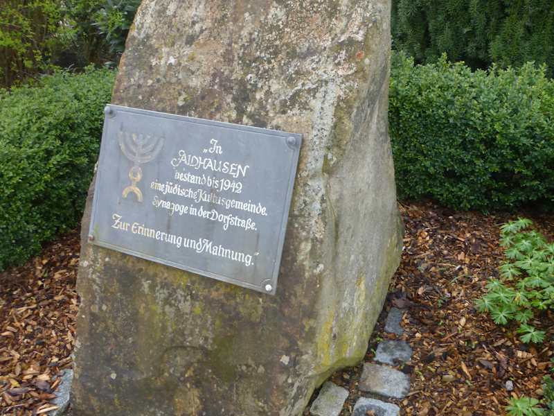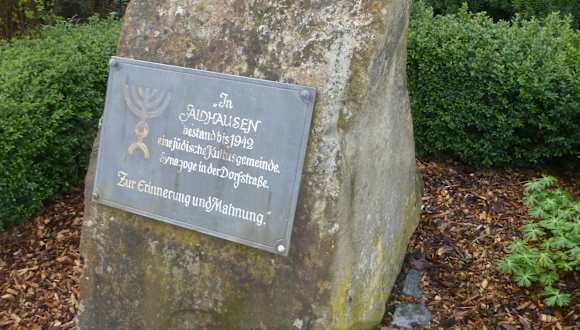 In Aidhausen befindet sich in der Frankenstraße / Ecke Pater-Kraus-Straße eine Gedenktafel, die an das Jüdische Leben in Aidhausen erinnert. Mindestens seit 1585 lebten Jüdische Mitbürger_innen in Aidhausen. Eine Jüdische Gemeinde entstand jedoch erst im 18, Jahrhundert. Diese Jüdische Gemeinde bestand bis 1942, als die letzten noch in Aidhausen verbliebenen Jüdischen Einwohner von den NAZIs in die Vernichtungslager deportiert und ermordet wurden. Diesen Menschen ist diese Gedenktafel auf einem großen Stein gewidmet und diese Gedenktafel ist zugleich eine Mahnung für uns und für folgende Generationen, damit derartiges nie mehr wieder geschieht. Leider gibt es aber inzwischen in Deutschland wieder Tendenzen, die die NAZI-Verbrechen verharmlosen. NAZIs, Antisemiten und Rechtsextremisten finden in Deutschland und in vielen anderen Ländern immer mehr Zulauf und verbreiten Terror. Faschisten finden ihre Gefolgsleute und sitzen auch wieder in Parlamenten. Dem muss man sich unbedingt entgegenstellen. Auch deswegen sind Denkmale wir diese Gedenktafel in Aidhausen ungeheuer wichtig.
