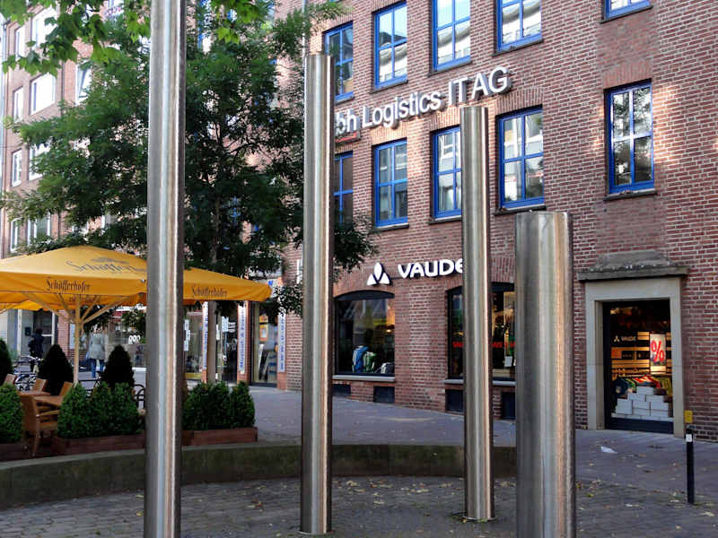 Der Gezeitenbrunnen steht am Ende der Pieperstraße in der Bremer Innenstadt und wirkt mit seinen vier wasserumflossenen Edelstahl-Säulen auf den ersten Blick wie „moderne Kunst“, dabei ist der Brunnen ein perfektes Abbild des Tidenverlaufes von der Nordsee bis zum Bremer Weserwehr. Mit seinen pneumatisch regulierten Pegeln, die unterirdisch in 12m tiefen, wassergefüllten Becken schwimmen, kann man die Welle der ansteigenden und abfallenden Wasserstände in Bremerhaven, Brake und Bremen visuell verfolgen und beeindruckend ist die Säule im Vordergrund, die den ebenfalls tideabhängigen Grundwasserstand der Hansestadt markiert. Gesteuert wird die Säulenhöhe in Echtzeit über Signale der Pegelstände vor Ort. Das Kunstwerk wurde von Wolfgang Zach 1992 geschaffen und seine ständig variable Größe macht besonders den vier Meter betragenden Tidenhub der Hansestadt eindrucksvoll sichtbar, der wesentlich höher als an der Nordseeküste ausfällt.