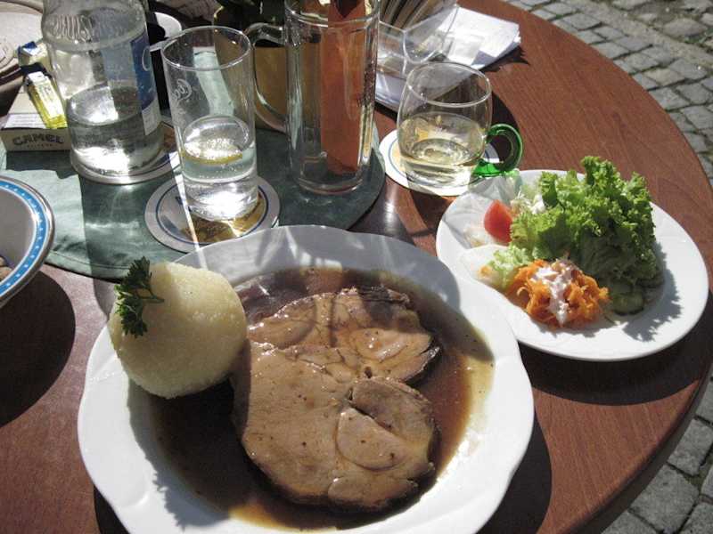 Wir besuchten einen Tag Dinkelsbühl und aßen im Goldenen Hirschen hervorragend zu Mittag. Preise Oktober 2009. Schweinsbraten mit Knödel und Salat 9,- EUR, Brotzeitplatte 5,- EUR, eine große Flasche Mineralwasser 2,- EUR, Frankenwein 3,70 EUR Außerdem gab es ein Mittagsangebot: eine Suppe, ein Hauptgericht (zwei stehen zur Auswahl) und ein kleines Getränk 5,60 EUR!