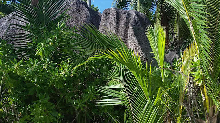 Toller Strand mit typischen Seychellen-Motiven