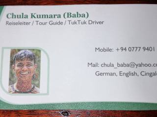 Hallo, das ist Baba Ihr Reiseguide für Sri Lanka. Wenn Sie auf der Suche nach ein- oder mehrtägigen Ausflügen sind, ist er die beste Adresse in Sri Lanka. Zu seinem Fuhpark gehört ein Tuk-Tuk und ein klimatisierter Reisebus. Zudem spricht er sehr gut Deutsch und Englisch. Er wird sich mit Ihnen zusammensetzen und individuelle Ausflüge mit planen. Er geht auf all Ihre wünsche ein, egal ob Sie allein, mit Ihrer Familie oder in einer Gruppe reisen. Nähere Informationen finden sich unter Baba-Lanka Koggala www.baba-lanka.de Facebook :- https://www.facebook.com/chulakumara.baba E-Mail: baba@baba-lanka.org Handy:-+94 0777 9401 42