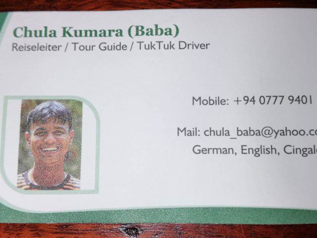 Baba ist ein freundlicher, sympathischer und humorvoller Reiseleiter und Tuk Tuk Fahrer. Welcher sehr gut Englisch und Deutsch spricht, zudem macht er auch noch faire Preise. Wir haben mit ihm kleine und große Ausflüge gemacht, sei es mit dem Tuk Tuk oder mit dem klimatisierten Reisebus (Fahrer Wasante). Auf all unsere Wünsche ist Baba eingegangen und hat dabei auch selbst Ideen und Tipps gegeben. Zudem bewahrte er uns vor Touristenfallen, wie überteuerten Geschäften. In den "guten" Geschäften hat er dann immer noch einen besseren Preis für uns verhandelt. Mit kleinen Aufmerksamkeiten, wie frisches Obst, sei es Litschis und Kokosnüsse, hat man sich rundum wohl gefühlt. Bei Besuchen in Tempeln oder Teeplantagen besorgte er uns "Vor-Ort-Führer" welche auch sehr gut deutsch sprachen und bestens erklärten. Gern saßen wir auch abends in geselliger Runde zusammen oder waren bei ihm zu Haus eingeladen. Gastfreundschaft wird hier groß geschrieben. Wir waren mit allem vollkommen zu frieden und werden wieder kommen....auch wegen Baba und Wasante. Wir wissen auch, dass dies unsere subjektive Meinung ist aber Baba wurde uns von Freunden und Hotelgästen empfohlen und wir wurden nicht enttäuscht.