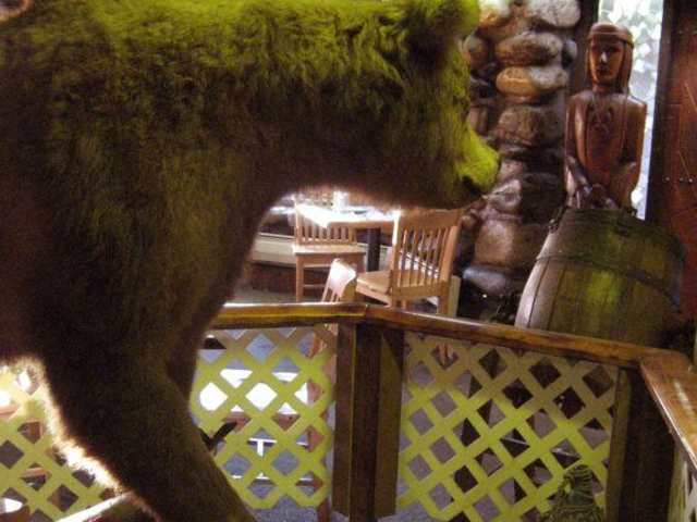 In der Spenard Road in Anchorage steht in der Nähe des internationalen Flughafens und dem Lake Hood (hier unbedingt die Unmengen vor Anker liegenden Kleinflugzeuge anschauen!) das „traditionsreiche“ Restaurant „Gwennie´s Old Alaska“, d. h. es besteht seit 1971 und ist in den letzten Jahrzehnten mit der Stadt gewachsen. Das Erdgeschoss nehmen die große Bar und ein kleinerer Teil des Restaurants ein, dessen Eingangstür von Totempfählen, einem verrückten Elch und einem ausgestopften Bären bewacht wird. Das Hauptlokal befindet sich im 1. Stock und ist mit Bildern aus der Entstehungszeit von Anchorage dekoriert. Allerlei gesammelter Schnickschnack vom gewaltigen Moose-Geweih und präparierten Bisonkopf bis zum abgebrochenen Propellerflügel an der Wand gibt weiteres Lokalkolorit. Die Speisekarte bietet eine breite Palette von üppigen Sandwichs bis zur „Fischermanns Platte“ mit ausgebackenen Köstlichkeiten des Meeres wie Austern, Scallops und Prawns, dazu 1-2 aufgeschnittene Beinchen von King Crabs, zwei Soßen und Pommes oder eine Baked Potatoe. Der knackige Salat dazu hatte eine hausgemachte Bluecheese-Sauce - alles sehr sehr lecker zu 25 $. Doch berühmt sind „Gwennie´s“ zarte Steaks in beachtlicher Größe. Den einzigen negativen Eindruck im „Gwennie´s“ hinterlassen die Toiletten, die zwar sauber sind, aber wegen heraus gebrochener Riegel leider alle nicht verschließbar,