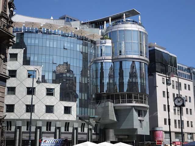 Das heutige Haas Haus gegenüber dem Stephansplatz ist ein moderner Baukörper. Die Aussenfassade besteht diagonal aus Mauerwerk und normalen Fenstern, die andere Hälfte, aus verspiegelten Fenstern. Vom Stephansplatz gibt es Standpunkte, von dort kann man sich den Stephansdom spiegeln sehen. Bevor ich nach Wien fuhr, hatte ich oben auf dem Dach Sonnenschirme gesehen, glaubte dann dort oben ist ein Café, von dort sieht man herrlich auf den Steffl. Als ich dann versuchte dieses vermeintliche Café zu betreten, wurde ich nicht eingelassen, denn das ist die Aussenbewirtschaftung des Hotel DO & CO. Auch mit netten Worten und der Versicherung, daß wir dort frühstücken wollten, natürlich gegen Bezahlung, nein sorry, geht nicht, nur für Hausgäste. Wegen Reichtum geschlossen, ich kann in den meisten Hotels gegen Bezahlung frühstücken. Und in dem unteren Stock, ist die Bar Onyx, dort dürften wir hinein, aber dort gibt es nur Fenster die so dunkel sind, wegen Verspiegelung, dort wollten dann wir nicht hinein. Das Haus ist ein Blickfang, wurde auch tausende Mal fotografiert.