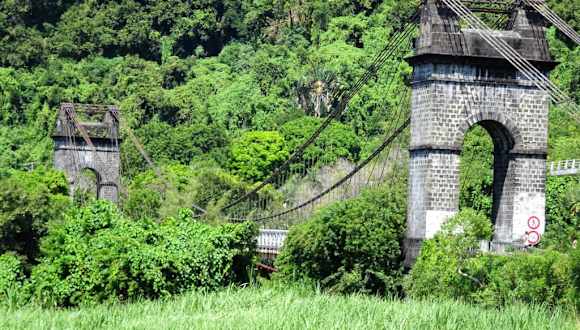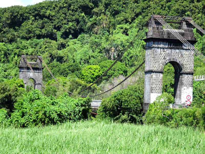 Kurz nach dem Ortseingang von Sainte-Rose trifft man bei der Fahrt in den Norden der Insel auf ein bauliches Meisterwerk: Die „Pont suspendu“, eine Hängebrücke von monumentalem Ausmaß, die den Fluss Rivière de l´Est überspannt. Nach fortgespülten Vorgängerkonstruktionen und nachdem schließlich noch eine Delegation des Generalrates beim Versuch der Flussquerung per Floß ertrank, wurde die Hängebrücke 1892 projektiert, in Zentralfrankreich konstruiert und zwei Jahre später eingeweiht. In der „Pont suspendu“, die seit 2014 unter Denkmalschutz steht, wurden allein 103 Kilometer Stahlkabel verbaut und zur Eröffnung galt sie mit einer Spannweite von 152 Metern als längste Hängebrücke der Welt. Inzwischen wird der Verkehr seit 1979 über eine moderne Brücke aus Spannbeton weiter flussaufwärts geleitet, während die „Pont suspendu“ nur noch für Fußgänger zugänglich ist.