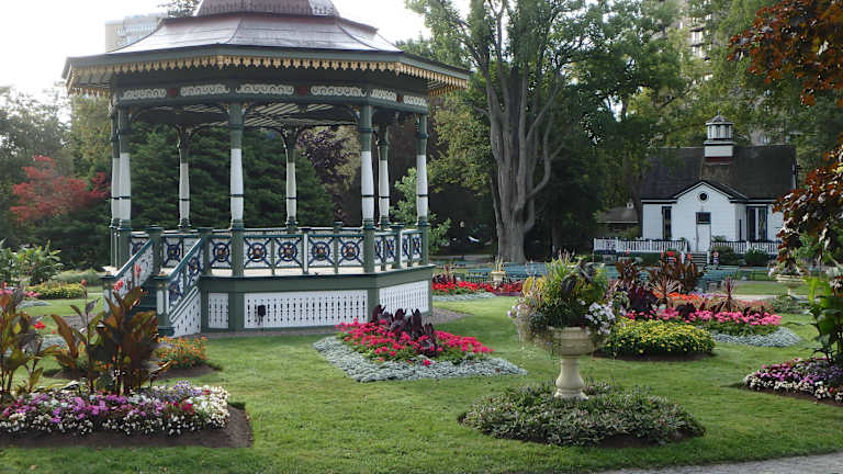 Der Mitte des 19. Jahrhunderts im viktorianischen Stil angelegte öffentliche Park "Public Gardens" ist heute eine Oase der Stille am Rande der hektischen Innenstadt von Halifax. Weitläufige Rasenflächen mit integrierten bunten Blumenarrangements wechseln sich ab mit schattenspendenden baumbewachsenen Gebieten. Hinter einem schönen schmiedeeisernen Eingang findet man im Zentrum des Gartens einen Musikpavillon und an den verschlungenen Wegen verzierte Brunnen, einen Teich, Statuen sowie zahlreiche Bänke zum Verweilen. Es herrscht eine Pracht an Farben und Formen, wie wir sie bisher nur selten in einer öffentlichen Anlage gefunden haben. Von Mitte Juni bis Mitte September soll es angabegemäß jeden Nachmittag im Musikpavillon Konzerte einer Band geben. Uns hat es im Park gefallen und wir können seinen Besuch nur empfehlen.