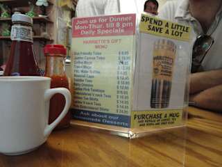 Das HARRIETS ist ein kleiner knallgelber Holzverschlag, in dem Hariett, die Inhaberin mit Ihren Mitarbeitern das beste frühstück auf den Keys zaubert. Das Lokal befindet sich beim Milemarker 96 in Fahrtrichtunh KeyWest von FloridaCity aus. Kaffee mit FillUp ohne Ende und "deftiges US Breakfast" zu zivilen Preisen. Bilder anbei.