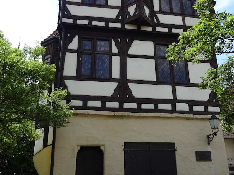 Das Gebäude stammt aus dem 15. Jahrhundert und wurde wenige Jahre nach Erstellung von Graf Eberhard im Bart gekauft. Neben der Fassade zur Straße hin fällt an der Seite auch ein schöner Anbau für die Treppe auf.