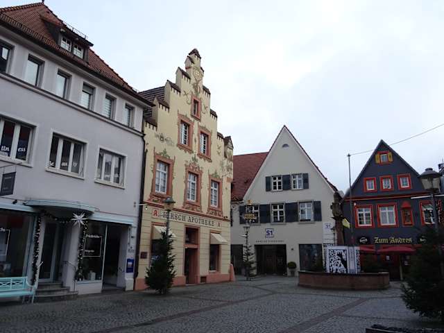 Das Gebäude "Hirsch-Apotheke" stammt selbst aus Ende des 17. Jahrhunderts. Die schöne Bemalung der Fassade im Stil der Spätrenaissance ist aus dem 19. Jahrhundert. Oben am Giebel ist ein Hirsch mit einem Kreuz zwischen seinem Geweih dargestellt. Schönes Fotomotiv in der Offenburger Innenstadt.