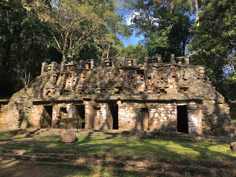 Yaxchilan war auf unserer Mundo-Maya Rundreise eines der Highlights. Wir kamen von Palenque. Für die 33o km kann man ca. 4 Std. Fahrt einplanen. Yaxchilan liegt im Bundesstaat Chiapas im dichten Regenwald, am Steilufer des Usumacinta. Dieser ist der Grenzfluss zu Guatemala. Yaxchilan ist nur auf dem Wasserweg erreichbar. In Frontera Corozal stiegen wir in ein Motorboot, das flußaufwärts ca. 50 Min. benötigte. Flussabwärts brauchten wir ca. 15 Min. weniger. Betritt man das Ufer hört man schon von weitem das impossante Geschrei der Brüllaffen. Diese Stadt war eine der mächtigsten am Fluss Usumacinta. Beherrschst wurde sie von Schild-Jaguar und später von seinem Sohn Vogel-Jaguar (insges. von 681-768). Hier gibt es zahlreiche Stelen und Tempelanlagen deren Dachkämme aus der Mayaklassikzeit stammen. Bisher wurde nur ein Bruchteil der Anlage freigelegt. Am Parkplatz gibt es ein Restaurant. Hier hatten wir vor der Besichtigung unser Essen vorbestellt. Klappte alles reibungslos. Hier in Yaxchilan gibt es keinen Touristenrummel mehr, nur wenige Einheimische die ein paar Souveniers verkaufen wollen. Ich habe Bernsteinschmuck gekauft, der hier aus Chiapas stammt. Hübsche Mitbringsel z.B. Ohrringe für ca. 4,-€.