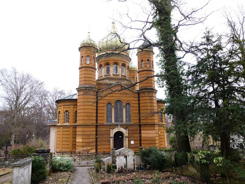 Der Historische Friedhof in Weimar ist ein Park im Südwesten der Stadt. Er ist einer der meistbesuchten Friedhöfe in Deutschland, denn hier wurden viele bekannte Persönlichkeiten beigesetzt. Er beherbergt die Weimarer Fürstengruft mit den Särgen von Johann Wolfgang von Goethe und Friedrisch Schiller (wobei festgestellt wurde, dass in diesem Sarg nicht seine Gebeine liegen). Außerdem grenzt direkt an die Fürstengruft eine kleine Russisch-Orthodoxe Kirche, die auf Wunsch von Großherzogin Maria Pawlowna (Enkelin von Katharina der Großen, Tochter des russischen Zaren Paul. I. und Ehefrau des Großherzogs Carl Friedrich von Sachsen-Weimar-Eisenach) über ihrem Grab errichtet wurde. Es existiert ein unterirdischer Durchgang von der Fürstengruft zur Kirche. Die Kapelle wird auch heute noch genutzt und ich betrat sie gerade in dem Moment, als der Priester einem Gläubigen seinen Segen spendete. Auf dem Friedhof finden sich die Gräber weiterer wichtiger Bürger von Weimar; unter anderem auch die der restlichen Familie Goethe oder die Grabstätte von Charlotte von Stein (enge Freundin von Goethe). Der Friedhof gehört zum UNESCO-Weltkulturerbe. Die Fürstengruft kann für 5,-Euro Eintritt betreten werden. In einem unterirdischen Raum sind die Särge von Goethe und Schiller zu sehen. Weitere Särge des großherzoglichen Hauses von Sachsen-Weimar-Eisenach sind dort untergebracht. Am Friedhofseingang befindet sich die „Gedächtnishalle“ für die Gefallenen des Ersten Weltkriegs. Ich fand die Besichtigung des Friedhofs und der Russischen Kapelle interessant; die der Fürstengruft eher unaufregend und ich empfehle, den Audioguide, der am Eingang erhältlich ist, zu nutzen, um mehr zu erfahren. Die Hördateien können auch kostenlos im Internet angehört werden: http://www.klassik-stiftung.de/einrichtungen/schloesser-und-gaerten/fuerstengruft/. Der Friedhof mit Fürstengruft und Russischer Kirche ist sehenswert.