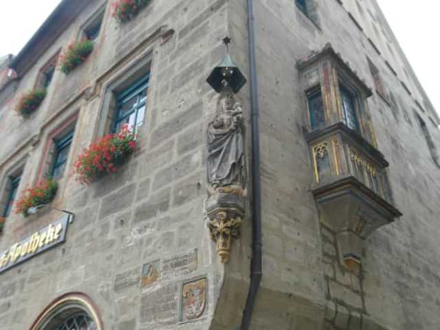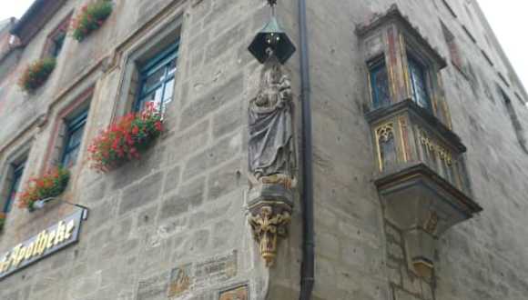 Eines der auffälligsten Gebäude an der Westseite vom Marktplatz ist die Hofapotheke. Das Vorderhaus zum Marktplatz hin wurde bereits im 15. Jahrhundert erwähnt. Bereits seit dem Jahr 1543 ist in diesem Haus eine Apotheke. Und schon seit dem Jahr 1846 ist die Apotheke im Besitz der Familie, die sie auch noch heute führt. Aber man sollte sich das Gebäude auch einmal näher anschauen, so findet man hier eine schöne Figur von Maria mit Jesus auf dem Arm, mehrere beschriftete Steine mit historischen Angaben zur Apotheke, einen schönen, interessanten Erker und eine Figur vom Heiligen Christophorus. Wenn man am Marktplatz ist, so sollte man sich die Hofapotheke unbedingt einmal anschauen, sowohl vom Marktplatz aus, als auch von der Steingasse aus.