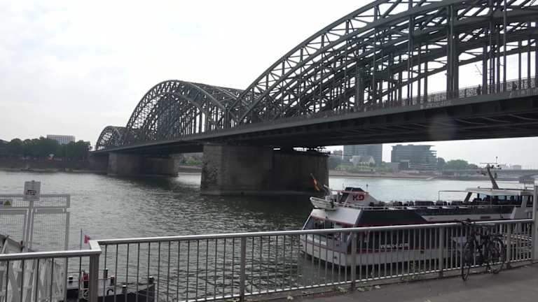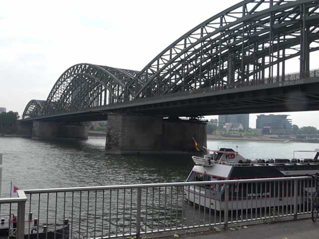 Die Fußgänger- und Eisenbahnbrücke ist ein fester Bestandteil des Stadtbildes von Köln. Mit 1220 Zugfahrten pro Tag ist sie die meistbefahrene Eisenbahnbrücke Deutschlands. Ein schöner Anblilck vom Rheinufer aus.