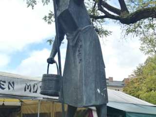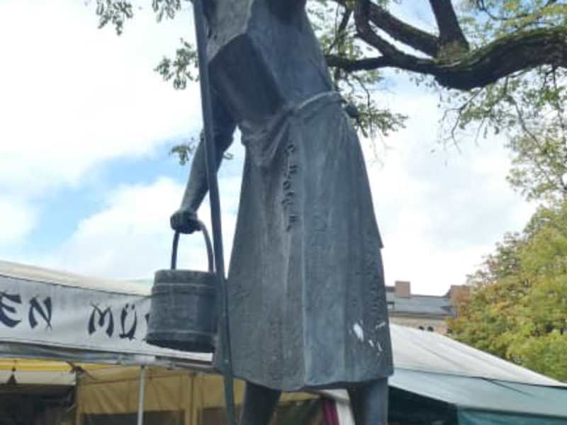 Der Ida Schumacher Brunnen befindet sich zwischen den Verkaufsständen am Viktualienmarkt und ist ein sehr beliebtes Photomotiv für Touristen. Ida Schumacher (05.03.1894 – 06.04.1956) war eine beliebte bayrische Theaterschauspielerin und Komödiantin. Als Ida Schumacher durch eine Krankheit ihre Gesangsstimme verlor, schien ihre Karriere als Volkssängerin beendet zu sein. Doch dieser Schicksalsschlag eröffnete Ida Schumacher eine Rolle, die sie über die Grenzen von Bayern unsterblich machte: Aus der Sängerin und Komödiantin, die bereits mit 13 Jahren im Chor des Münchner Künstlertheaters debütiert hatte, wurde die bekannte und beliebte "Ratschkathl". Die Figur „Ratschkathl“ wurde von der berühmten Volksschauspielerin Elise Aulinger erfunden. In der Rolle als „Ratschkathl“ beeindruckte die wortgewaltige Ida Schumacher als Idealbesetzung für diese Rolle als Klatschtante. Berühmt wurde sie u.a. auch als „Oatandlerin“ (Eierverkäuferin) und als „Trambahnschienenritzenreinigungsdame“, die Emil Vierlinger für Ida Schumacher geschaffen hatte. Emil Vierlinger (11.10.1909 – 12.07.1984) war nach dem 2.Weltkrieg als Hörfunk Moderator beim Bayerischen Rundfunk sehr populär. Er moderierte "Bunte Abende", Sendungen wie das „Samstagsbrettl“ und organisierte seit den 1950er-Jahren die Übertragung des Derbleckens auf dem Münchner Nockherberg. Auch als Volksschauspielerin an Theatern in Nürnberg, Tegernsee und am Platzl in München war Ida Schumacher sehr erfolgreich. Zu Ehren der drei Münchner Originale Elise Aulinger, Roider Jackl und Ida Schumacher wurden am 23.09.1977 auf dem Viktualienmarkt drei Brunnendenkmale enthüllt. Der Ida Schumacher Brunnen auf dem Viktualienmarkt wurde 1977 von Marlene Neubauer-Woerner gestaltet. Die Brunnenfigur zeigt sie mit Schrubber und Putzeimer beim "Ratsch im Treppenhaus". Marlene Neubauer-Woerner (25.08.1918 – 01.01.2010) schuf nach dem 2.Weltkrieg eine Vielzahl von Skulpturen für öffentliche Auftraggeber in Bayern. Im Jahr 1984 wurde ihr der Bayerische Verdienstorden verliehen. Wie ich feststellte, war auch der Ida Schumacher Brunnen sehr begehrt, als Trinkbrunnen bei Einheimischen und Touristen bei der Sommerhitze im August. Der stetig sprudelnde Wasserstrahl erinnert nach Aussage eines alten Münchners, an den nie aufhörenden Wortschwall von Ida Schumacher.