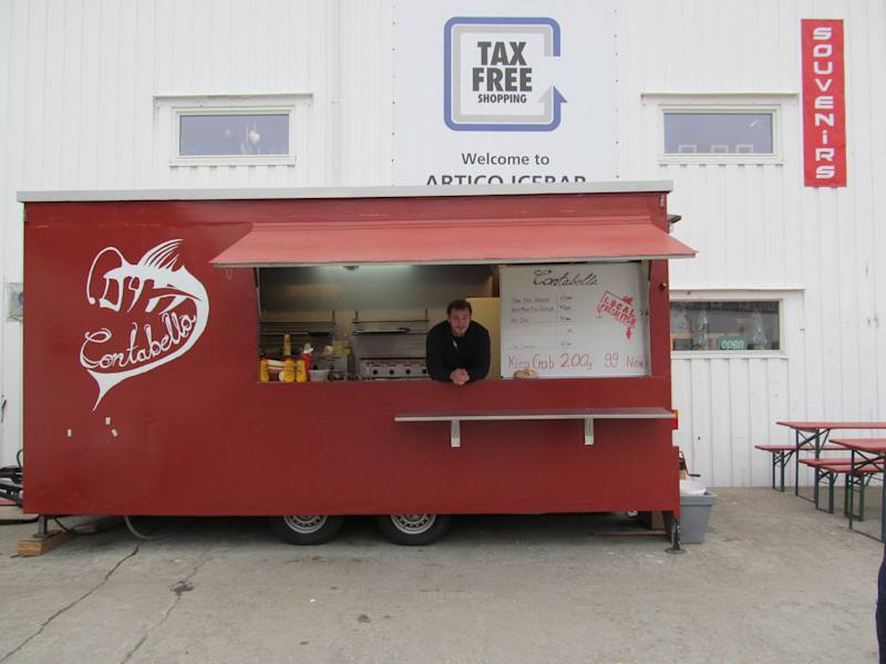 Am Hafen vor der Eisgrotte steht ein Würstelstand. Neben dem üblichen Programm an HotDogs und Burgern bietet er auch nordnorwegische Spezialitäten, Dorschzungen und Königskrabben. Wer so etwas einmal probieren will, kann das dort ziemlich unaufwändig tun. Verständigungsprobleme gibt es keine, der Betreiber ist Österreicher!