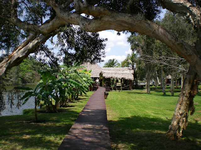 Von der Anlegestelle bei der Krokodilfarm(20000 Krokodile), brachte uns ein Boot auf dem Fluss Lago del Tesoro im Nationalpark, im Sumpfland, zum künstlich erbauten Indianerdorf Guama am Schatzsee. An Makroven vorbei fährt man in eine bezaubernde, ursprüngliche Landschaft , in der Reiher, Komorane, Fischadler, Geier und Aligatoren etc. ihre Heimat haben. Am Ende der ca. 20 minütigen Fahrt erwartet den Besucher eine Gruppe "Indianer",(den Ureinwohnern Kubas) die uns mit Liedern willkommen heissen.Unter Kokospalmen empfängt den Besucher ein nachgebautes Indianerdorf.Durch Skulpturen einer Künstlerin wird das Leben der Indianer nachgestellt. Durch Holzstege sind die einzelnen Hütten miteinander verbunden. Eine Hütte kann sogar besichtigt werden. Selbstverständlich gibt es auch ein kleines Restaurant auf der kleinen Insel.