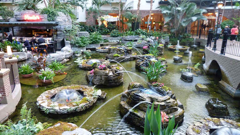 Ein Hotel, eingebettet in eine tolle überdachte Landschaft mit Wasserläufen, Wasserfällen, viele exotische Pflanzen und Springbrunnen mit Musik. Der Innenhof des Hotels, wo sich die Anlagen alle befinden ist so groß, dass man sich an den Wegweisern orientieren muß, um sich nicht zu verlaufen. Überall schöne Plätze zum Verweilen, ein Paradies also, wie es im Buche steht. Man muß nicht im Hotel übernachten, nein einfach besuchen und das schöne Flair genießen. Ein Besuch, der sich allemal lohnt, wenn man in Nashville ist.