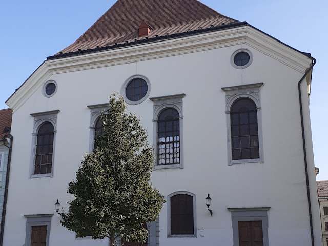 Die Kirche des Jesuitenordens befindet sich am Hauptplatz der Stadt direkt neben dem historischen Rathaus. Wegen dieser Lage gab es beim Bau zwischen 1636 und 1638 strenge Auflagen. So durfte das Gebäude nicht das Aussehen eines Sakralbaus haben, und der Bau eines Turms war untersagt. Dadurch kam es, dass ein schlichtes Gebäude im Stil der Spät-Renaissance entworfen wurde, und die römisch-katholische Kirche eher das Aussehen eines evangelischen Bethauses erhielt. Der Turm, den man neben der Kirche sieht, gehört zum Rathaus, nicht zur Kirche. Die Kirche der Jesuiten steht nur wenige Schritte entfernt von der Kirche der Franziskaner. Der Gegensatz der beiden Kirchen ist bemerkenswert. Während die Jesuitenkirche eher schmucklos ist, ist die mehrere Hundert Jahre ältere Kirche der Franziskaner recht prunkvoll ausgestattet.
