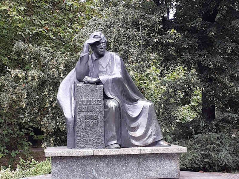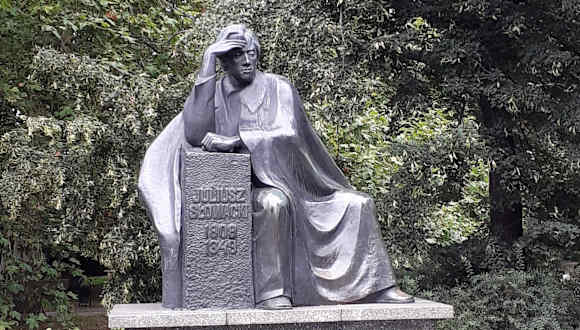 Juliusz Słowacki war einer der „Drei Barden“ und gehört zu den wichtigsten Vertretern der polnischen Romantik. Er lebte in der ersten Hälfte des 19. Jahrhunderts und gilt als Vater des modernen polnischen Dramas. Sein Denkmal steht in dem nach ihm benannten Park am Rand der Altstadt von Breslau.