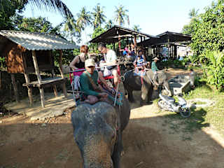 Wir haben direkt beim Elefantencamp für 700 baht (statt für 800 Baht im Hotel oder bei einem Reisebüro). Beeinhaltet ist das Abholen vom Hotel, Kaffee bis es losgeht, 1 Stunde Elefantenritt mit einem Mahout, eine Flasche Mineralwasser, Obst beim Warten auf den Shuttle, Rücktransport zum Hotel. Das Camp hat einen Babyelefanten und einige halbwüchsige Elefanten, die man füttern und anfassen darf. Der Elefantenritt zusammen mit anderen Touristen geht ein Stück ins Hinterland bis zu einem Badeplatz so sich der Elefant kurz erfrischen darf, dann auf eine Anhöhe mit guter aussicht auf die Meeresbucht und auf drei vorgelagerte Inseln. Leider verstand der Mahout kein Wort English. Das camp empfiehlt am besten am Vormittag, je früher desto besser, den Ritt zu unternehmen. Das kann ich nur bestätigen, wegen der Lufttemperatur und der klaren Ausssicht. Nachmittags soll außerdem es zu viele Moskitos geben.