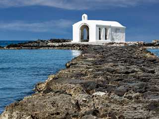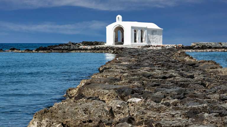 Bei hohem Wellengang kommt man nicht trockenen Fußes des Steinweg zur Kapelle hinüber (wobei "Weg" eigentlich das falsche Wort für eine Reihe großer Steine ist). Ein wenig beschwerlich ist es schon, auf den glitschigen Felsbrocken - aufgereiht, um die Hafeneinfahrt zu befestigen - zum Ziel zu kommen. Und auch im Inneren gleicht die Kapelle wohl den gefühlt tausend anderen auf der Insel. Doch ist es ein romantisch faszinierender Ort, man hat einen schönen Blick über den Strand und sogar eine Hochzeitsgesellschaft hat während unseres Aufenthaltes dort ihre Zeremonie abgehalten. Also genau das Richtige für einen Abendspaziergang während eines Urlaubes in Georgioupolis.