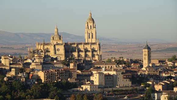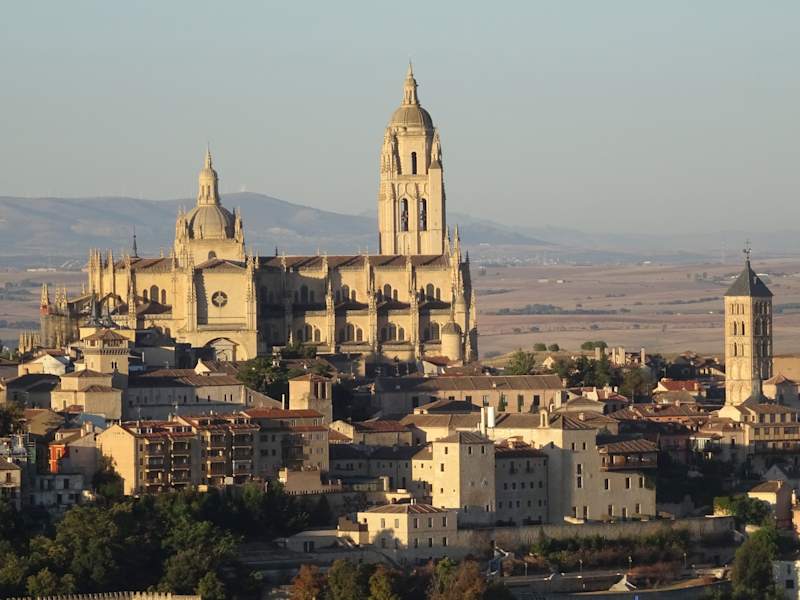 Die "Santa Iglesia Catedral Nuestra Señora de la Asunción y de San Frutos", wie sie mit vollem Namen heißt, befindet sich auf der Plaza Mayor, dem höchsten Punkt der Altstadt von Segovia. Das heutige Gotteshaus wurde im Auftrag von Kaiser Carlos V. ab dem Jahr 1525 als Ersatz für die während des Volksaufstandes im Jahr 1520 zerstörte alte Kathedrale, die sich in der Nähe des Alcázar befunden hatte, nach den Entwürfen des Architekten Juan Gil de Hontañón im spätgotischen Stil errichtet. Die Bauarbeiten dauerten, auch wegen eines zwischenzeitlichen Blitzeinschlags, bis zum Jahr 1684, was zur Folge hatte, dass sich in dem Klerikalbau Elemente aus Gotik und Renaissance vereinen. Die Kirchenweihe war im Jahr 1768. Die in Form eines lateinischen Kreuzes gebaute Kathedrale hat drei Schiffe und ein Querschiff, mehr als 20 Kapellen und einen fast 90 Meter hohen Glockenturm. Über der Vierung befindet sich eine große Kuppel. Kunsthistorisch bedeutsam ist der von dem italienischen Architekten Francesco Sabatini geschaffene neoklassizistische Hauptaltar mit einem Bildnis der Jungfrau Maria. Sehenswert sind die Kapellen, das aus der alten Kathedrale stammende Chorgestühl, die Buntglasfenster und die zwei Barockorgeln. Vom Kirchturm hat man einen spektakulären Blick auf Segovia und die Umgebung. Homepage: https://catedralsegovia.es/