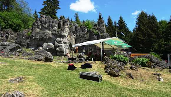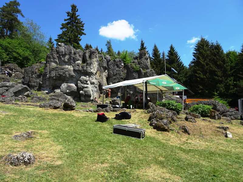 In den sanften Hügeln rund um Bad Staffelstein würde man den „Kemitzenstein“ nicht erwarten: Eine schroffe Dolomit-Felslandschaft ragt unvermittelt in den Himmel – alpines Flair samt Schutzhütte und einem echten Klettersteig. Archäologische Grabungen vor dem Kemitzenstein erbrachten mit Funden von Tierknochen, Äxten und Keramiken Gewissheit, dass dieser Ort schon in der Jungsteinzeit als Kultstätte diente. Heute ist das 580 Meter hohe Felsriff ein beliebtes Ausflugsziel für Familien, die hier auf dem Rasenstück vor der beeindruckenden Bergkulisse ihr Picknick abhalten, während Kletterer sich über kurze Routen bis auf das bewaldete Gipfelplateau vorarbeiten. Jedes Jahr zu Pfingsten wird es am Fuße des Kemitzenstein richtig quirlig, denn die Ortsvereine organisieren dann ein traditionelles Volksfest mit Musik, Grillvergnügen und reichlich Bier aus der Region. Mehrere Wege führen zum Kemitzenstein, den man entweder in einem etwa 15-minütigen Fußweg ab Kümmersreuth von der Staatsstraße 2204 aus erreicht oder ab dem Parkplatz am „Hohlen Stein“ bei Schwabthal über einen ausgeschilderten Weg durch die Felder, um dann am Steinbruch dem Rad-Wegweiser zu folgen.