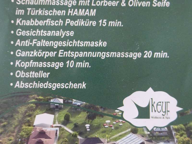 Sehr schöner Nachmittag in entspannter Atmosphäre. Hatten ein Programm vom Hotel aus gebucht, bestehend aus Salzsauna, Schlammbad, Schaumbad, Doktorfisch und Massage und sind sehr zufrieden. Freundliches Personal und gute Organisation. Würden es wieder buchen.