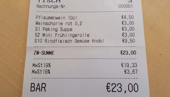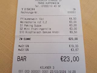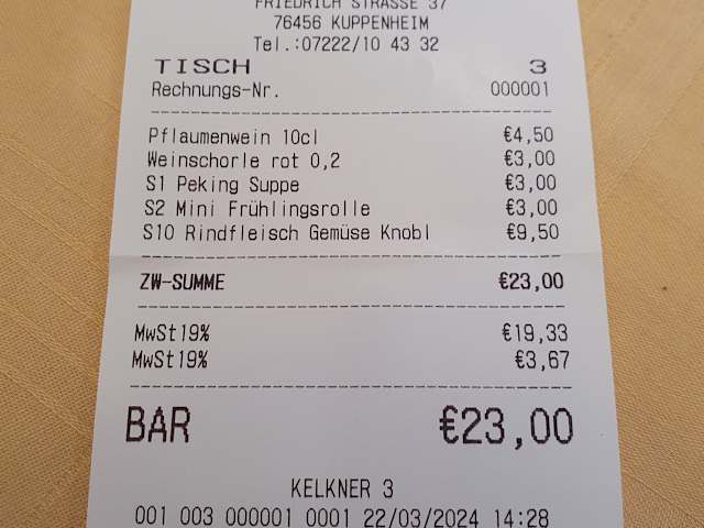 Besuch am Freitag, 22. März 2024 zum Mittagstisch Ich habe das Asiatische Spezialitäten Restaurant "Kinh Do" in Kuppenheim zum Mittagstisch besucht. Das Restaurant öffnet um 11 Uhr seine Türen und bietet von Dienstag bis Freitag (außer Feiertage) 13 Gerichte auf der Mittagskarte an, unabhängig von der normalen Karte, aus welcher man ebenso bestellen kann. > Weinschorle rot 0,2l für 3,00 € > S1 - Peking Suppe, sauer pikant für 3,00 € > S2 - Mini Frühlingsrolle, vegetarisch) 6 Stück für 3,00 € > S10 - Rindfleisch mit verschiedenem Gemüse, Knoblauch und Basilikum - leicht scharf für 9,50 € > Pflaumenwein 10cl für 4,50 € **************************************** - Preis-/Leistungsverhältnis ist gegeben - Ambiente schlicht - an der Außenfassade kann man noch den Vorgängernamen lesen - Service: Teelicht zu Beginn wurde nicht angezündet, Rechnung wurde erst auf mein Verlangen erstellt und gebracht nachdem ich bezahlt hatte + positiv: Servicekraft frägt beim Pflaumenwein ob klein oder groß + während der einzelnen Gänge wird gewartet, bis der Gast fertig gegessen hat Essen: die Soße bei den Frühlingsrollen ist nicht die Standardsoße die man sonst üblich kennt, aber grundsätzlich gut; das Rindfleisch war geschmacklich gut.