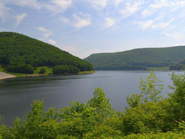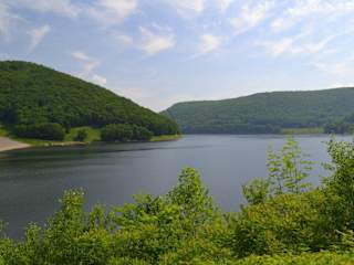 ... östlich des Mississippi! Als ich am 18. Juni 2011 mit dem Auto von Warren in Richtung Wellsboro gefahren bin, hatte ich mich für eine Route entlang des Flusses entschieden, die mich zufälligerweise am Kinzua Staudamm vorbei geführt hat. Es handelt sich durchaus um ein imposantes Bauwerk, auch wenn man es heutzutage leider nicht mehr von innen besichtigen kann. Der Kinzua Staudamm ist einer der größten Staudämme der USA östlich des Mississippi und befindet sich östlich von Warren im US-Bundesstaat Pennsylvania. Von der Innenstadt aus sind es etwa über neun Meilen bis zum Staudamm. Mit dem Auto ist er sehr leicht zu erreichen. Idealerweise nimmt man in Warren den US-Highway 6 nach Südosten, der Warren als "Pennsylvania Avenue" durchzieht. Nachdem man den Fluss überquert hat, gibt es eine Abzweigung nach links auf den Highway 59, die so genannte Kinzua Road. Dieser führt am Fluss entlang, bis man zum Staudamm und den dahinter gelegenen Kinzua Lake kommt. Als einer der größten Staudämme der USA ist der Kinzua Staudamm durchaus sehenswert. Allerdings kann er sich nicht mit dem Hoover Staudamm bei Las Vegas messen. Auch kann man den Kinzua Staudamm nicht überqueren, sondern kann diesen nur von außen besichtigen. Ursprünglich war es möglich, den Staudamm komplett zu besichtigen und Touren durch das Stauwerk zu bekommen. Nach den Terroranschlägen vom 11. September 2001 wurden die Touristenführungen aus Sicherheitsgründen eingestellt. Somit bleibt einem heute nur noch die Möglichkeit, mit dem Auto zum Staudamm zu fahren und auf dem angrenzenden Parkplatz zu halten. In meinem Fall lag der Kinzua Staudamm auf dem Weg zu meiner nächsten Etappe, so dass ich ohnehin an ihm vorbei gekommen bin. Es war daher wirklich nur ein Zufall. Allerdings ein Zufall, der sich wirklich gelohnt hat. Preislich ist der Kinzua Staudamm für Touristen natürlich perfekt, da er nicht mehr von innen besichtigt werden kann. Der große Besucherparkplatz ist frei befahrbar. Architektonisch ist der Staudamm durchaus sehenswert. Sehenswert ist am ehesten die Westseite, bei der die Staumauer steil nach unten abfällt. Bedauerlicherweise befindet sich der Parkplatz an der Ostseite, die dem Stausee zugewandt ist. Hier hilft wirklich nur, einen Fußmarsch nach Westen anzutreten. Da der Staudamm in den Jahren 1960 bis 1965 errichtet worden ist, ist er selbst nach heutigen Maßstäben noch recht neu und bietet dem Auge nichts, was man nicht auch bei anderen Staudämmen sehen könnte. Der Staudamm befindet sich heute immer noch in Betrieb und augenscheinlich in einem sehr guten Zustand. Ein bauliches Monument inmitten der Natur. Historisch betrachtet ist der Staudamm für die Region von großer Bedeutung. Bereits in den 1930er Jahren hatte man Überlegungen angestrengt, den Staudamm zu errichten und den Kinzua Lake aufzustauen. Erst im Jahr 1960 hat man schließlich mit dem fünf Jahre andauernden Bau begonnen. Dabei war der Bau des Staudamms sehr umstritten, da dieser nämlich das Reservat der Seneca Indianer betroffen hat, der letzten Ureinwohner der Region. Letztendlich hat man sie nach Norden in den Bundesstaat New York umgesiedelt, wo sie heute ihr Reservat am Nordufer des Kinzua Lakes haben. Alles in allem ist der Kinzua Staudamm ein sehenswertes Monument von einiger Bedeutung. Ob sich ein gezielter Ausflug zum Staudamm allein lohnt, muss jeder für sich selbst entscheiden. Meiner Meinung nach bietet er jedoch in Verbindung mit dem Kinzua Lake einen interessanten Ausflug. Zumal er verkehrsgünstig gelegen ist.