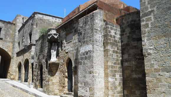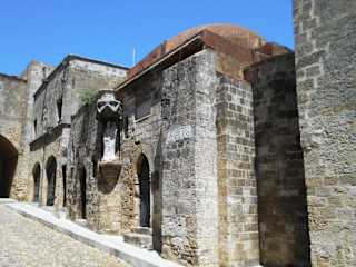 Zwischen den anderen Häusern an der Straße der Ritter erkennt man das Gebäude kaum als Kirche. Über dem Eingang sieht man mehrere Wappen, die den Rittern aus England zugeordnet werden. Wie viele andere Kirchen, wurde auch diese während der osmanischen Herrschaft in eine Moschee umgewandelt. Unter der anschließenden italienischen Besetzung wurde wieder eine Kirche aus dem Gebäude und eine Marienstatue mit Kind an der Fassade angebracht. Ebenfalls im 15. Jahrhundert wurde im jüdischen Viertel von Rhodos eine weitere Kirche mit dem Namen „Agia Triada“ errichtet, die erst in den letzten Jahren restauriert wurde.