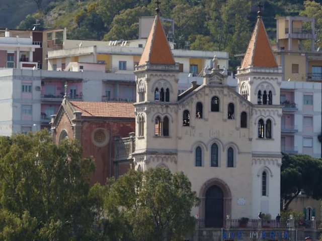 Die Kirche liegt hoch über der Stadt mit Blick bis hin zum italienischen Festland auf der anderen Seite der Straße von Messina. Aber dieser Blick belohnt für den etwas beschwerlichen Aufstieg. Vor der Kirche steht eine Statue des verstorbenen Papstes Johannes Paul II., die über die Stadt blickt.