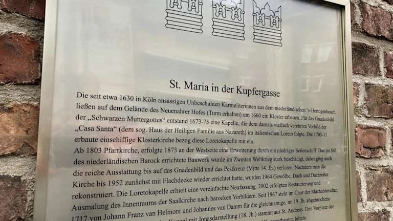 Die römisch-katholische Wallfahrtskirche "St. Maria in der Kupfergasse", eines der wenigen barocken Kirchengebäude in Köln, befindet sich an der Straßenecke Neven-DuMont-Straße/Schwalbengasse in der Kölner Innenstadt. Das im Auftrag des Ordens der Unbeschuhten Karmeliterinnen im Stil des niederländischen Barock errichtete Gotteshaus wurde im Jahr 1715 geweiht. Es umschließt die zwischen 1673 und 1675 gebaute Laurentinische oder Loretokapelle, in der seit dieser Zeit ein aus Lindenholz geschnitztes Gnadenbild der Schwarzen Muttergottes verehrt wird. Sehenswert ist der barocke Machabäeraltar im Kircheninneren. Adresse: Schwalbengasse 1 50667 Köln Deutschland Webseite: https://www.kupfergasse.de/ Kontakt: st.maria-kupfergasse@katholisch-in-koeln.de +492212576237