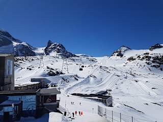 Am Ende von Zermatt geht es mit verschiedenen Gondeln, jeweils modern und sauber, bei guter Sicht auf das kleine Matterhorn. Unterwegs ist die Sicht auf die Berge und das Matterhorn schon grandios. Über Steilhänge und kleine Gletscher erreicht man die Bergstation, in den Berg gebaut, und von Weitem kaum sichtbar. Über einen Aufzug und anschließenden Treppen erreicht man die Top-Aussicht, 360°, von Italien, Frankreich, Mont Blanc, bis hin zu den Schweizer Berner Alpen mit der Jungfrau. Die Fahrt lohnt sich auf jeden Fall, auch wenn die Luft auf fast 3900m Höhe sehr gering ist. Man kann die Skifahrer, Bergsteiger beobachten und auch kostenlos den Gletscherpalast besuchen mit Gletscherspalten und Eisgebilden.