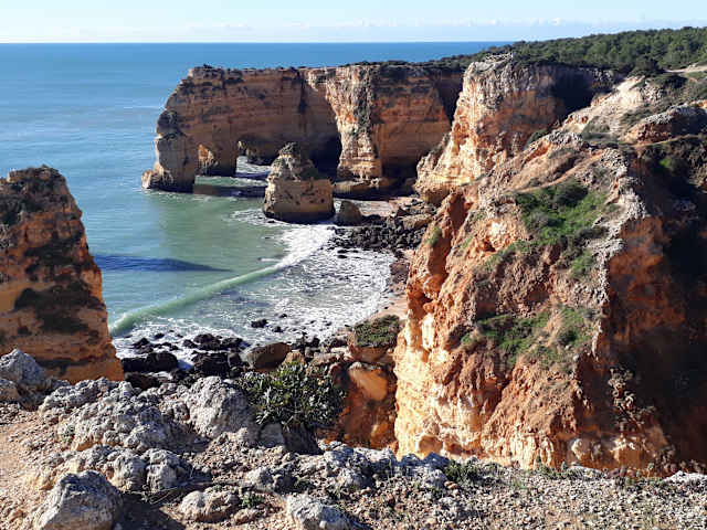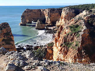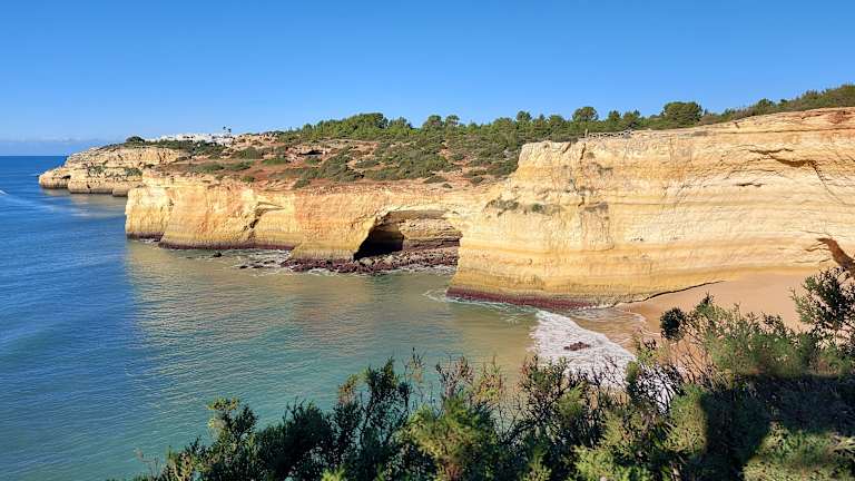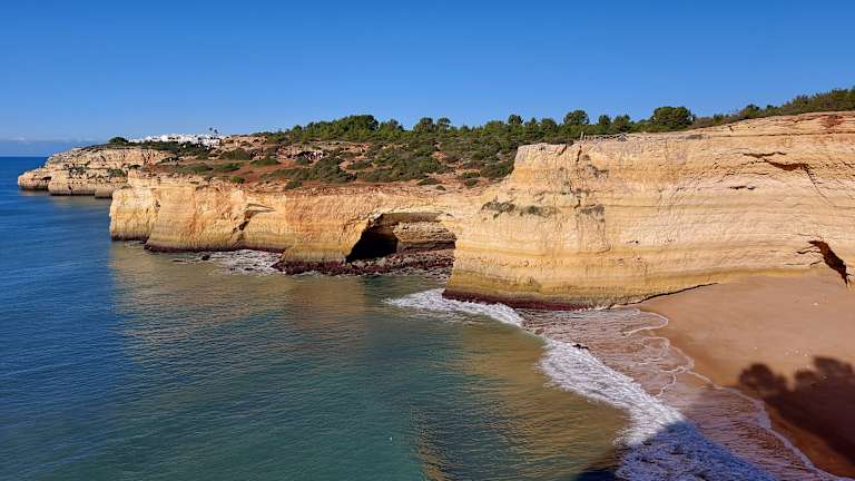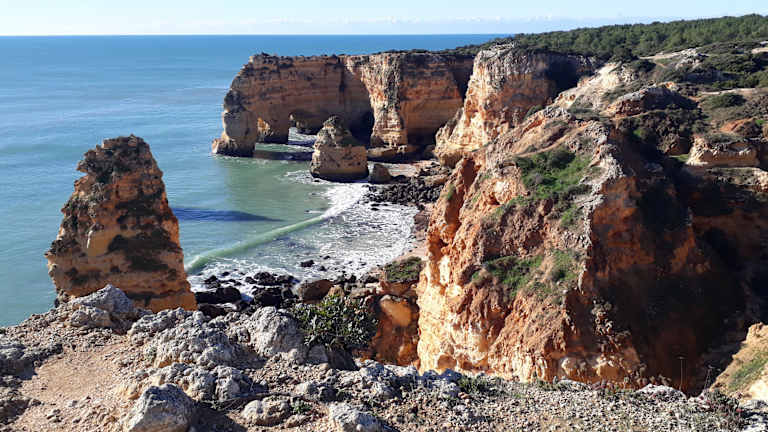 Wir hatten eine äußerst interessante Wanderung von der Ermida da Nossa Senhora da Rocha über Benagil nach Carvoeiro unternommen. Besonders das Gebiet um / bei Benagil war äußerst spannend. Der Weg ging - hoch über dem Atlantik - auf der Steilküste entlang. Unterwegs kamen wir an vielen Buchten mit teils schönen Stränden vorbei. Die Ausblicke auf die Felsküste mit tollen Felsformationen war fantastisch. Es gab auch Höhlen, bei denen die Decke eingebrochen war und wir konntn dadurch nach unten in die Höhlen blicken (und dabei auch in den Höhlen den Wellengang des Atlaniks beobachten. Ich würde diesen Abschnitt bei Benagil als den Höhepunkt unseres Wanderurlaubs an der Algarve betrachten.