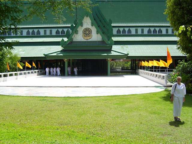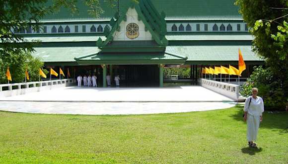 Das Kloster der Weissen Nonnen liegt ca. 10 km vor dem Sai Yok Noi-Wasserfall auf der Straße Riwer Kwai, Tigertempel dann nach ein paar Kilometer Richtung Wasserfall ging es nach links ab. Dort angekommen zogen auch wir weisse Kleidung an und gelangten über eine Brücke in das riesige Areal, mit etlichen Gebäuden zum meditieren, gepflegten Anlagen und auf dem Berg steht ein weithin sichtbarer Tempel. Als Name wurde uns Daenmahamongkol genannt. Auch soll dort eine Deutsche seit 20 Jahre leben. Leider wissen wir nicht mehr über diesen sehr beeindruckenden Ort. Viele Thai-Familie verbringen dort ein Wochenende.