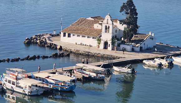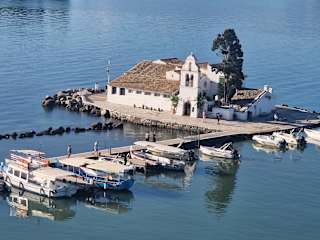 Das Kloster Vlacherna zählt, mit seiner schneeweißen Fassade und dem roten Ziegeldach, zu den beliebtesten Fotomotiven Korfus. Über einen schmalen Damm erreicht man die winzige Felseninsel, auf der im Jahre 1685 das ehemalige Nonnenkloster mit der kleinen Kapelle zu Ehren der Jungfrau Maria errichtet wurde. Heute steht das Kloster leer - nur ein Souvenirshop im Blumen geschmückten Klosterhof wird noch betrieben. Verfasst von HolidayCheck