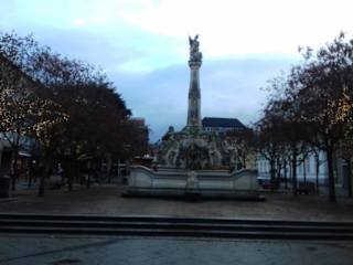 Der Kornmarkt ist ein großzügig angelegter Platz, dessen Fläche zur Zeit meines Aufenthaltes zu einem großen Teil von dem dort aufgebauten „Winterland Trier“ eingenommen wurde. Es machte Spaß, den Kindern beim Schlittschuhlaufen zuzuschauen, allerdings konnte man sich von dem Platz an sich dadurch keinen hundertprozentigen Eindruck machen. Dennoch – allein schon der prächtige Georgsbrunnen aus dem 18. Jh. (1750), das Casino von 1825 und das wirklich sehr schöne ehemalige Postgebäude machen aus dem Platz einen Hingucker. Im Einzelnen: Das Postgebäude liegt an der Stirnseite des Platzes in der Fleischstraße. Zuvor befand sich dort das Palais Kronenburg (von 1759). Dieses wurde 1880 abgerissen und auf dem Gelände entstand das Postgebäude mit Fassadenelementen des früheren Palais. Genau gegenüber steht heute der Georgsbrunnen – heute, da er früher in der Mitte des Platzes zu finden war. Als er umgesetzt wurde, hat man wohl neben einem Grundstein zwei Flaschen Ebling gefunden, Jahrgang 1750. Zum Georgsbrunnen: Der Obelisk soll 11m hoch sein, obenauf St. Georg, der mit dem Drachen kämpft. Unten sind die Allegorien der vier Jahreszeiten zu sehen und zu ihren Füßen kleine Drachen als Wasserspeier. Der Brunnen wurde zu Ehren des Kurfürsten von Schönborn errichtet. Bleibt das dritte schöne Gebäude des Platzes – das Casino. Dort soll es Ballsäle u. ä. gegeben haben und war wohl für die Feierlichkeiten der gut gestellten Bürger gedacht. Der französischen Armee diente es im 20. Jahrhundert zweimal als Offizierscasino. Bis zum Zweiten Weltkrieg gab es noch ein drittes schönes Gebäude am Kornmarkt – das alte Rat- und Kaufhaus gegenüber dem Casino. Der ursprüngliche Bau stammte aus dem 15. Jahrhundert, später wurde er vergrößert. Der Kornmarkt war übrigens ursprünglich ein Lagerplatz. Erst im 18. Jh. wurde beschlossen, hier einen „Neuen Markt“ zu gestalten. Kurfürst von Walderdorff ließ dafür eine Verbindung zwischen der Brot- und der Fleischstraße herstellen. Und stimmt, das ist praktisch und erspart den Weg über den Hauptmarkt. Natürlich ist der Kornmarkt längst nicht so attraktiv wie der Hauptmarkt mit seinen vielen schönen Gebäuden. Ich habe aber sehr gern am ruhigeren Kornmarkt Pause gemacht, bevor ich mich zum krönenden Abschluss des „Kultur-Tages“ in die Shoppingzone der „Galerie“ begab :-) (Quellen: Infos vor Ort / Baedeker „Trier“ / 2008 )